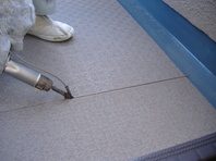 共用通路床面長尺シート貼り工事を行いました。下地の不良個所を補修した後に施工しました。